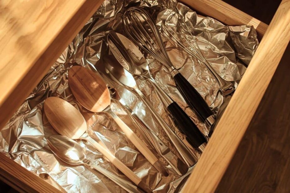 O papel de alumínio nas gavetas da cozinha funciona como uma barreira descartável contra a humidade, protegendo a madeira do inchaço e facilitando a limpeza.